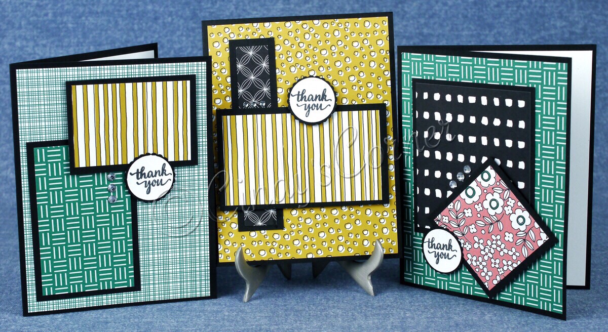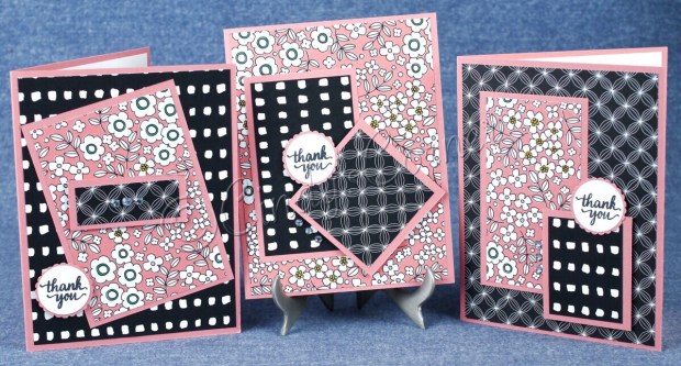 The ‘Thank You’ is from the Eastern Beauty Stamp Set stamped on Whisper White with Memento Black ink then cut with 1″ circle punch and layered onto Basic Black cut with 1 1/8 Scallop Circle Punch. On all the cards the 3rd layer was attached with Stampin’ Dimensionals an each card had 3 rhinestones added for bling.
