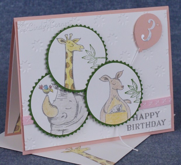 Our youngest grand-daughter just turned 3! Cannot believe how quickly those 3 years have passed. Nearby where they all live in the UK is a Wildlife Park, a favorite place for a family day-out. So when it came to making her a card this year the Animal Outing Stamp Set, which I got when attending the Stampin’ UP! demonstrator conference at the beginning of April, was perfect for her birthday card.