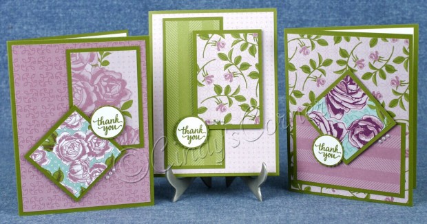 The ‘Thank You’ is from the Eastern Beauty Stamp Set stamped on Whisper White with Old Olive ink then cut with 1″ circle punch and layered onto Old Olive cut with 1 1/8 Scallop Circle Punch. On all the cards the 3rd layer was attached with Stampin’ Dimensionals an each card had 3 rhinestones added for bling.