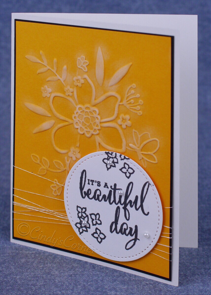 The Mango Melody layer was run thru the Big Shot with the embossing folder, then I took a sponge dauber with some Whisper White Craft Ink and just highlighted the raised part to give it more definition. Did you know that Stampin’ UP! did a white ink? (check on page 202) the pad comes uninked and with a bottle of ink to add yourself.