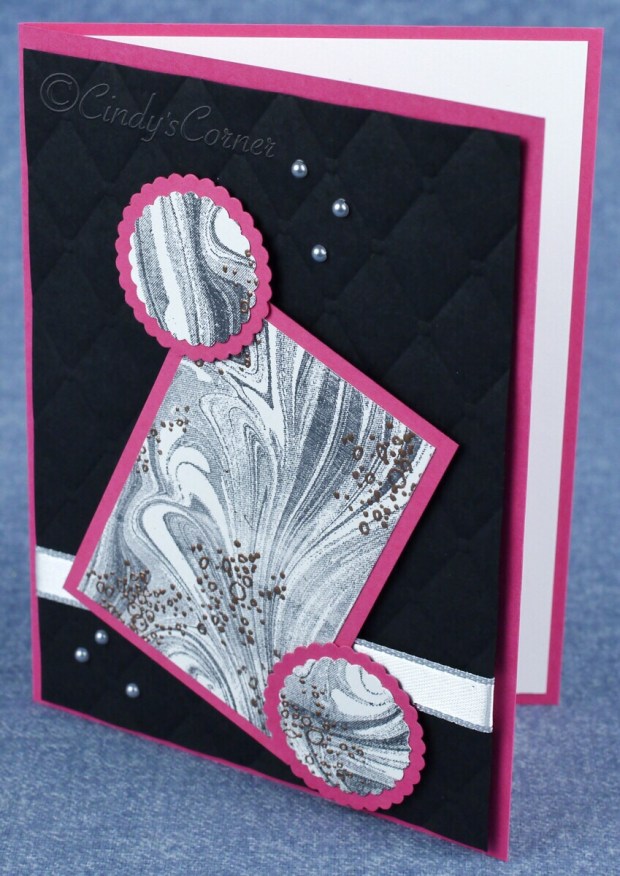 I have a monthly technique class and am always looking for new ways of using paper, stamps and ink. The Marbled Background Stamp has been in my stash for a few months and I wanted to use it for ‘something’ but not sure what – so I played for a while starting with stamping Memento Black ink and a quarter sheet of Whisper White card.