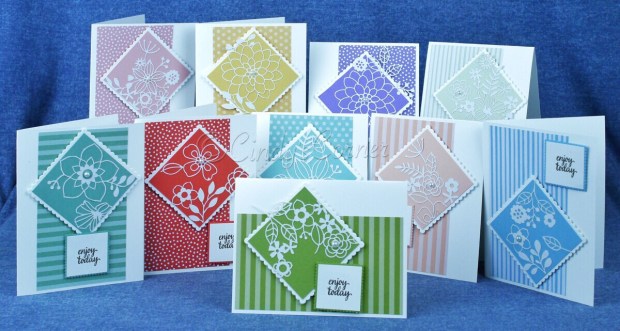 I used the Layering Squares Framelits to cut the pieces for each of the layers as well as for the greeting which is from the Eastern Beauty Stamp Set. Each card has a slightly different layout depending on landscape or portrait orientation and I highlighted some of the flowers with a Basic Jewel Pearls.