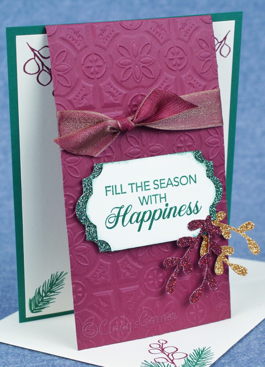 Layer 1: 10 3/4 x 3 Merry Merlot Card ~ scored @ 5 1/4 with the longer of the two sides runs thru the Big Shot with the Tin Tile Dynamic Textured Impressions Embossing Folder