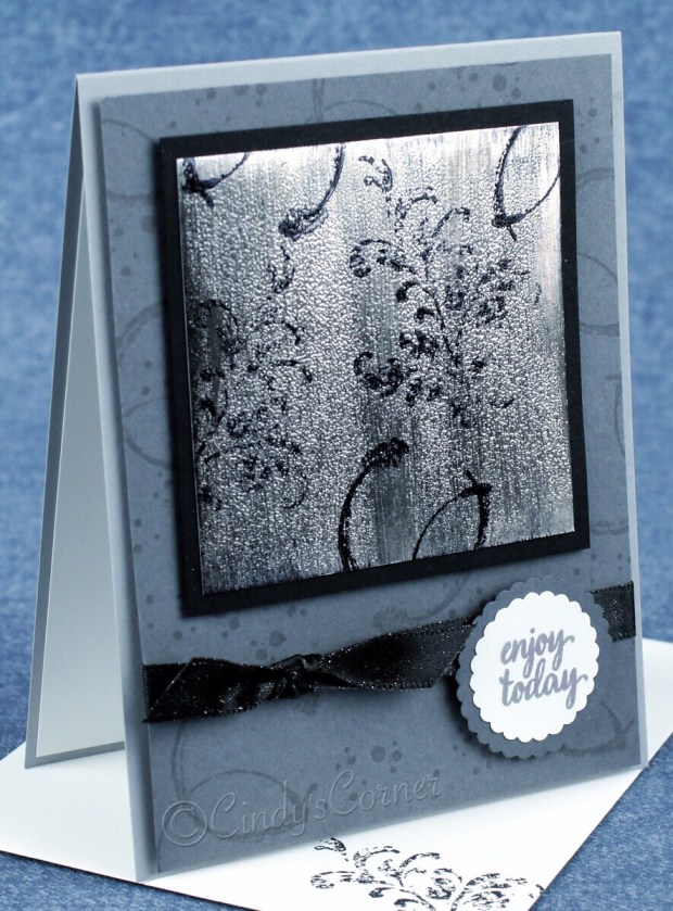 Layer 2 is randomly stamped with Basic Gray ink using the Timeless Texture Stamp Set and attached to the base card with 4/5 Stampin Dimensionals. The ribbon is the 1/2 Black Satin using a faux knot (click here to see more about this)