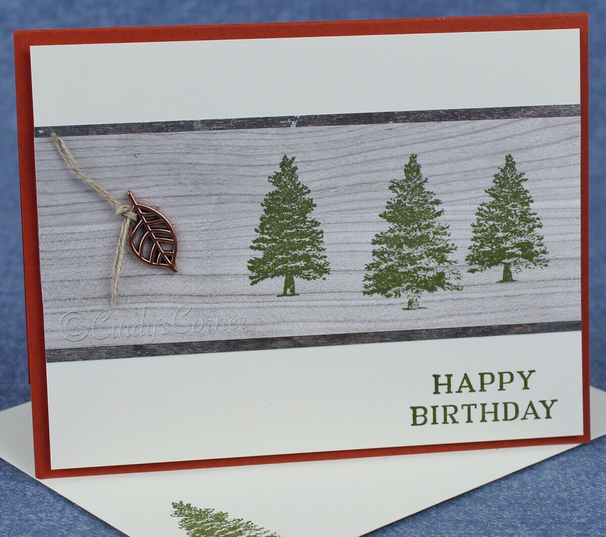 The trees were stamped directly onto the light wood DSP and over to the right so there is enough room for the Leaves Trinket and a little twist of Linen Thread. All layers were adhered with Multipurpose Liquid Glue with a glue dot to hold the trinket and linen thread.