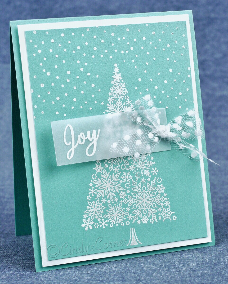 I used the heat embossing technique to stamp the tree and the falling snow on the 2nd layer, then stamped ‘joy’ onto a scrap of vellum card, sprinkled white embossing powder on it then very gently heated with the heat gun, being so thin it is easy to scorch the vellum so you need to keep the tip of the heat gun moving. I used a glue dot on the right hand side of the vellum strip to attach it to my card then hid this by placing a bow of 5/8 Whisper White Polka Dot Tulle Ribbon over the top.