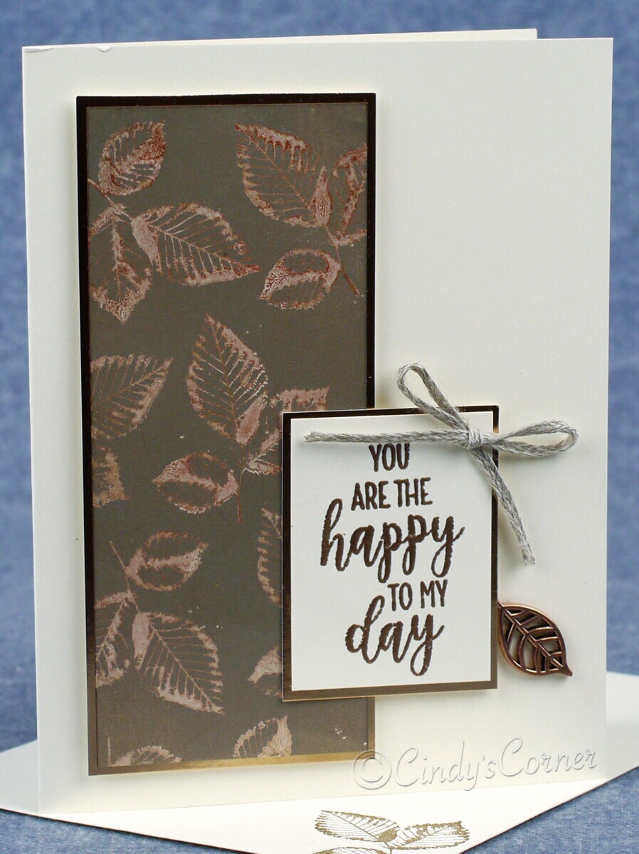 I broke out the Copper Embossing Powder, along with my heat gun to create the greeting; added a bow made from the 3 1/6 Braided Linen Trim and topped it all of with one of the Leaf Trinkets, both attached with a mini glue dot ~ very autumnal and perfect for Thanksgiving Day