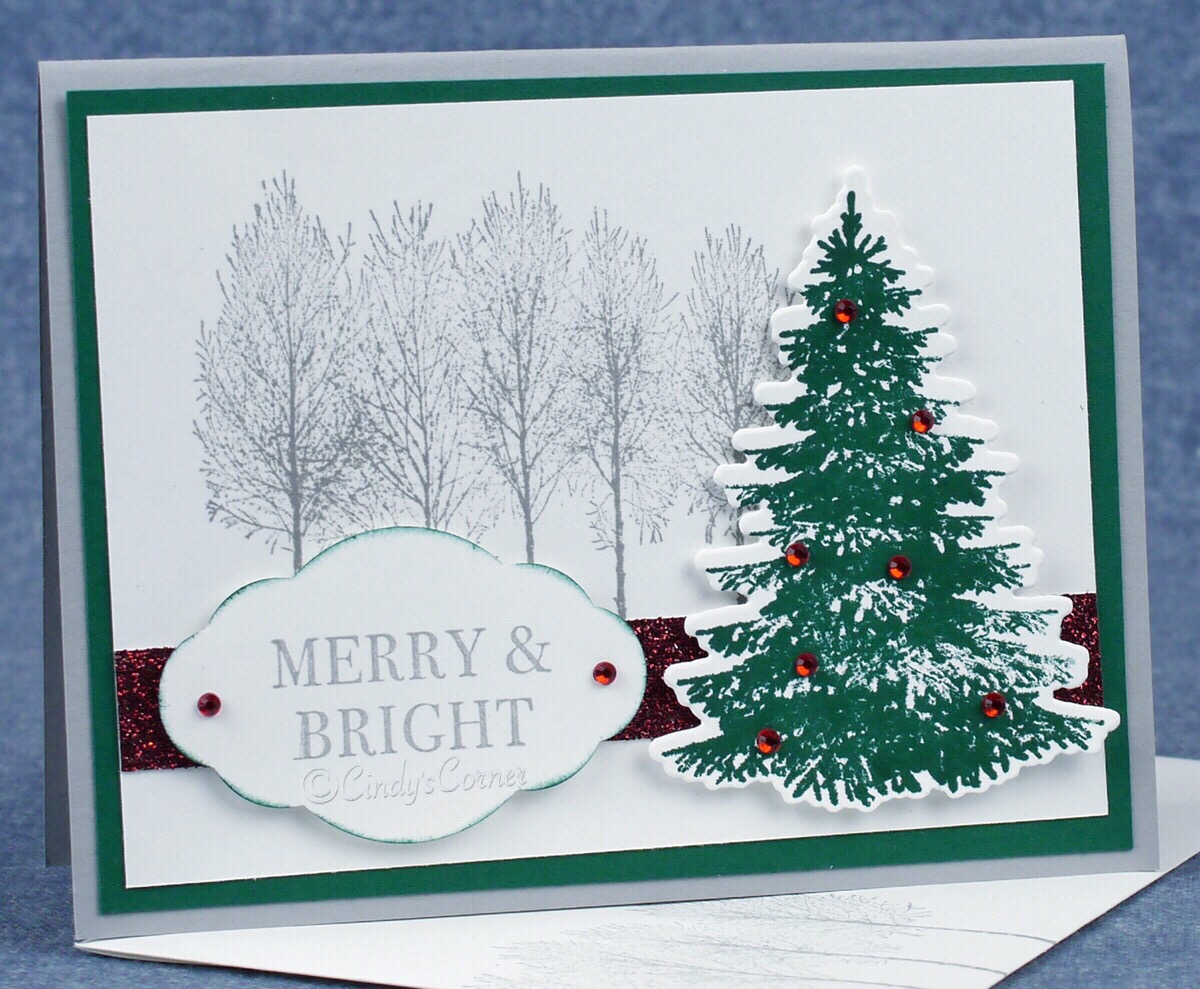 The background trees were stamped first then the Glimmer Paper strip attached with a couple of Mini Glue Dots, the tree was stamped and cut with the matching die then attached with 4 – 5 Stampin Dimensionals. The greeting punched using the Pretty Label punch with a little sponging around the edges with Shaded Spruce to give it a little pop, then a final scattering of Red Rhinestones.