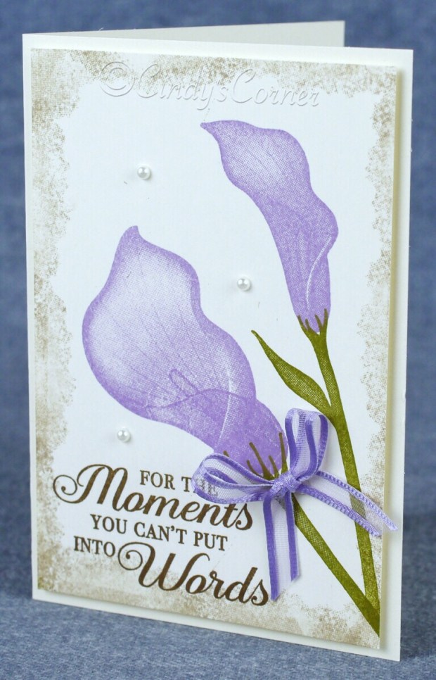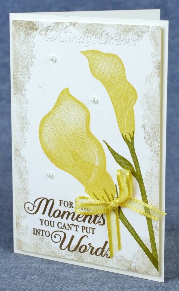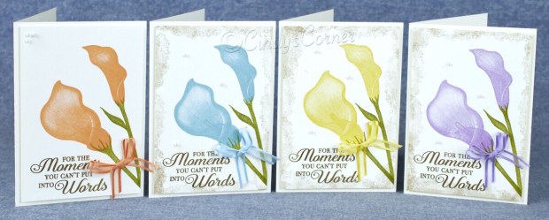 I used the Very Vanilla Notecards and envelopes with Old Olive, Crumb Cake and Early Expresso on all cards then picked out the color of the ribbon for the lilies – Grapefruit Grove, Balmy Blue, Daffodil Delight and Highland Heather. There is a fifth ribbon in the pack – Lemon Lime Twist which I will show in a later project.