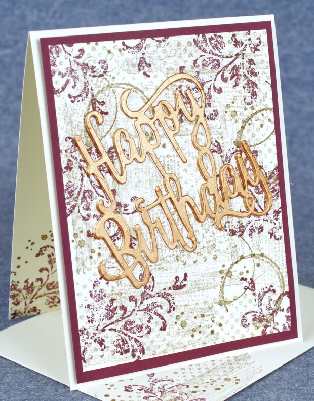 I have created a birthday card using the Happy Birthday Framelit Die using the  technique as my focal point, so the stamping is very simple using the Timeless Textures Stamp Set to create a background on which to present the Happy Birthday.