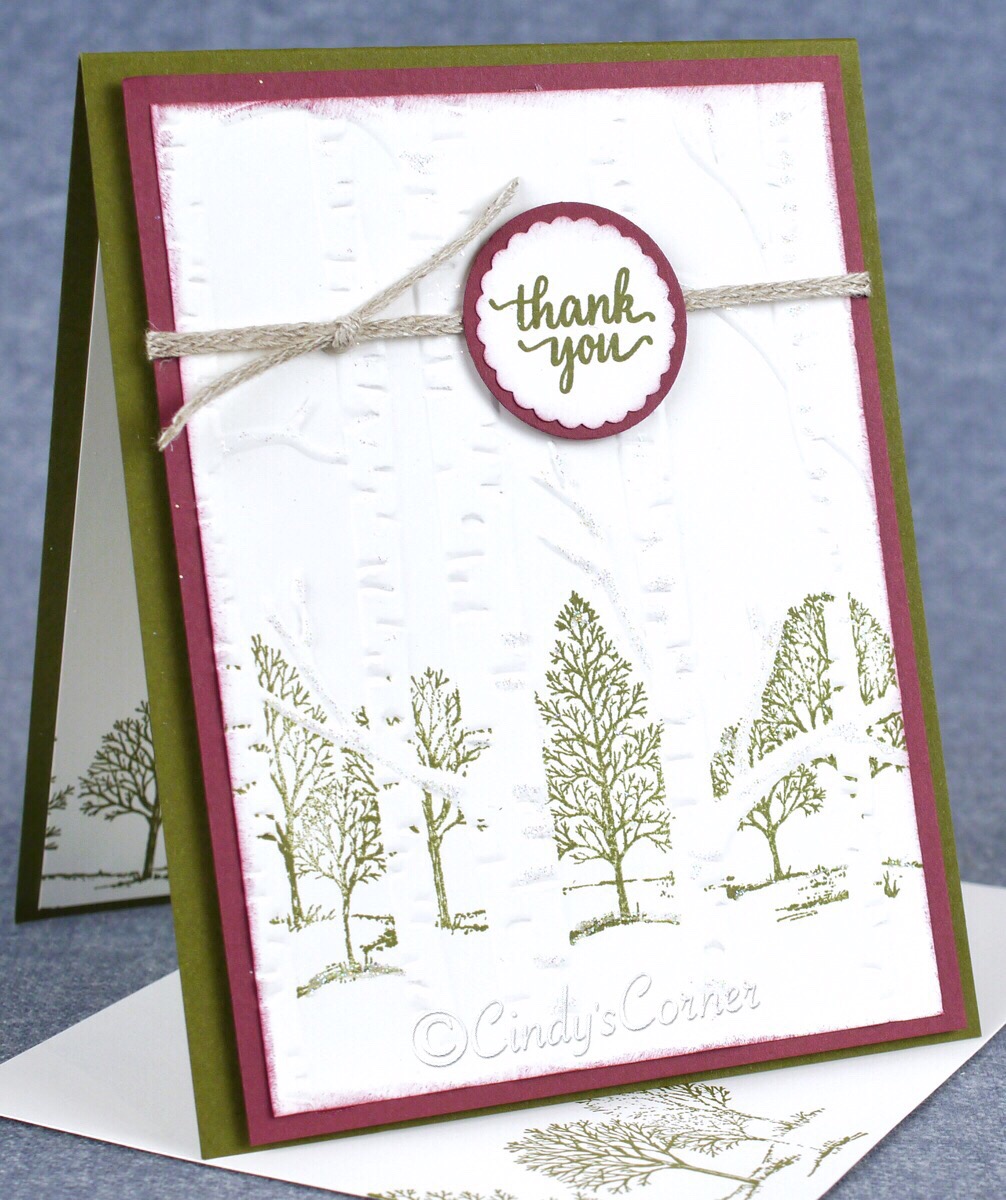 I chose to use the Lovely as a Tree Stamp Set along with the Woodland Embossing folder. As this stamp set does not have any greetings I used one from the Eastern Beauty Stamp Set and created a thank you card, but it would work as a really great card for the fellas in our lives or maybe a Christmas card simply by changing the greeting.