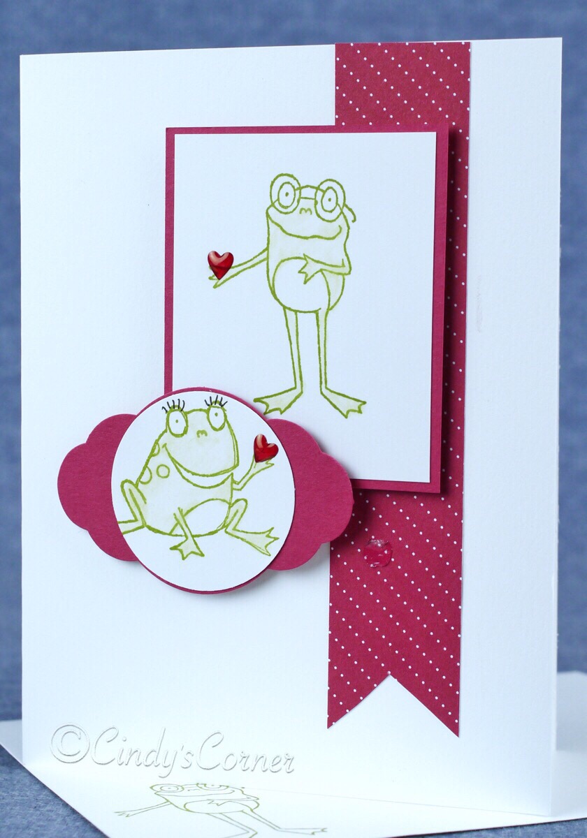 I stamped both of my froggy sweethearts in Granny Apple Green then used a Blender Pen to pull a little of the ink to shade them and give a little substance. The eyelashes for the lady frog were hand-drawn using a Journaling Pen, she was then cut out with 1 1/2 Circle Punch and layered onto some Lovely Lipstick card cut with the Pretty Label Punch. Both frogs were attached to the base card with Stampin Dimensionals.