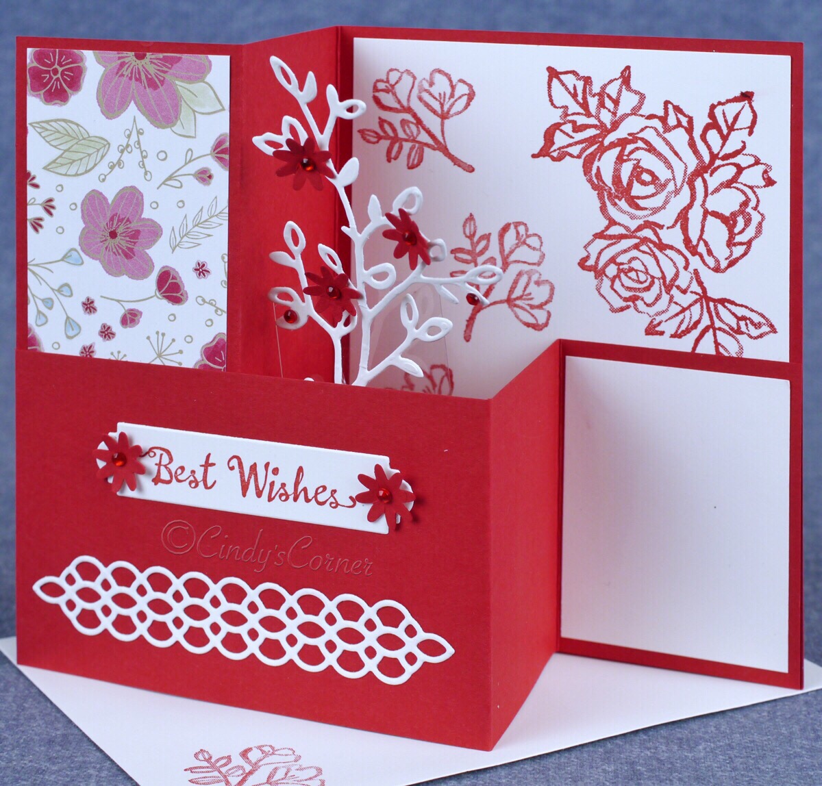 Today’s card is one we made during our January card class and it is a variation of the Z fold card, with a cute little 3D embellishment. My inspiration came from a the Christmas card my dear friend, Elly, of ElleMentry Papercrafting in the UK, sent me.