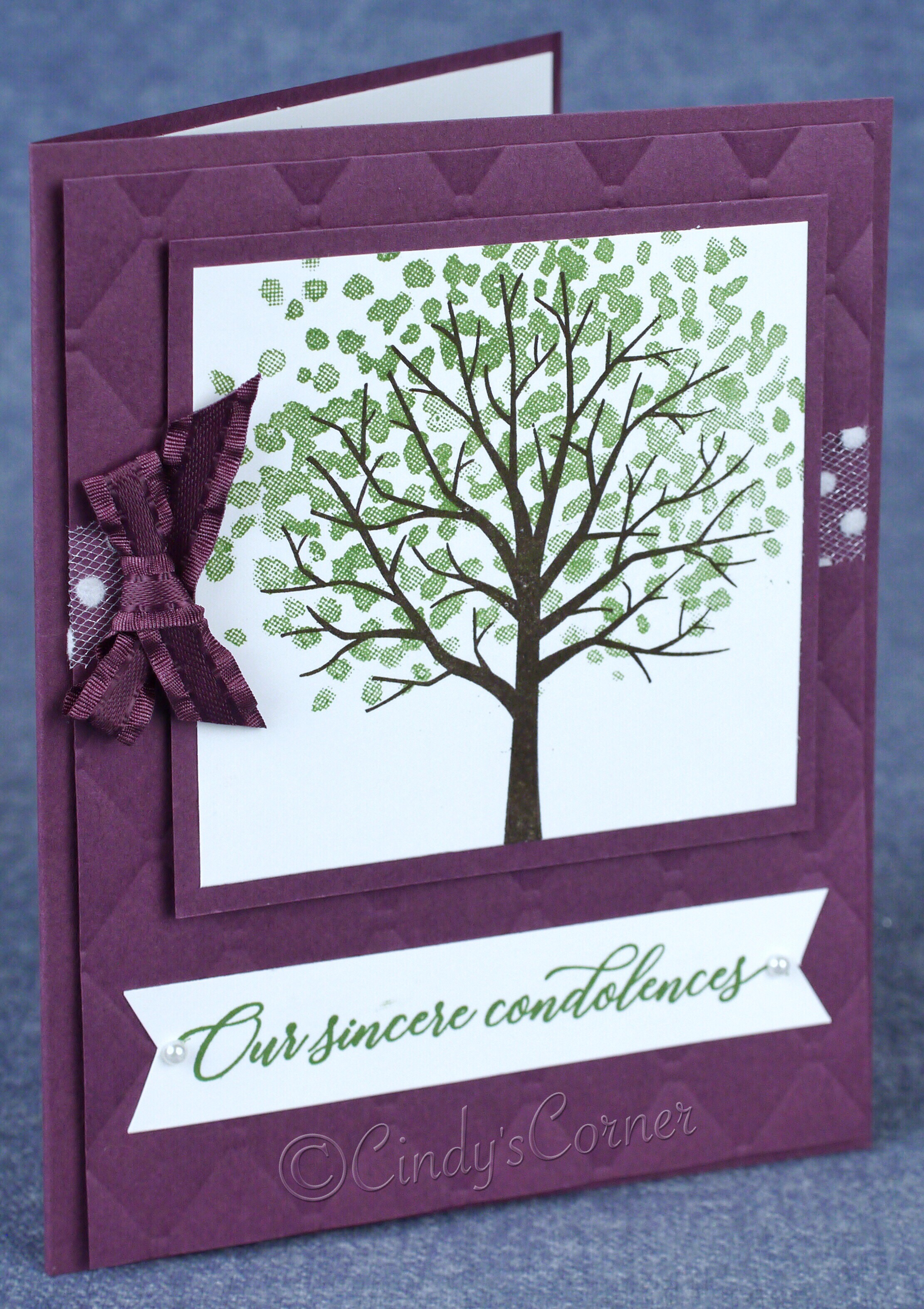 The embossed layer is popped up on 4 – 5 Stampin Dimensionals after a length of Very Vanilla Polka Dot Tulle was wrapped around. The the stamped panel added with 4 Stampin Dimensional s and a bow of Fresh Fig 3/8 Mini Ruffled Ribbon added with a mini glue dot.