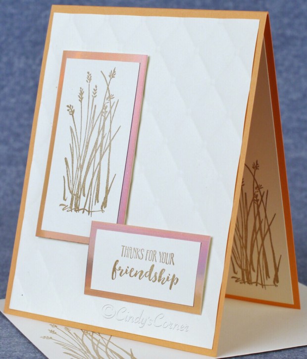 The panel with the grasses measures 3 x 1 1/2 and the greeting 2 x 1 of Very Vanilla then both are layered onto the Grapefruit Grove Foil with a 1/8 border all round. Both panels are popped up with some Stampin’ Dimensionals.
