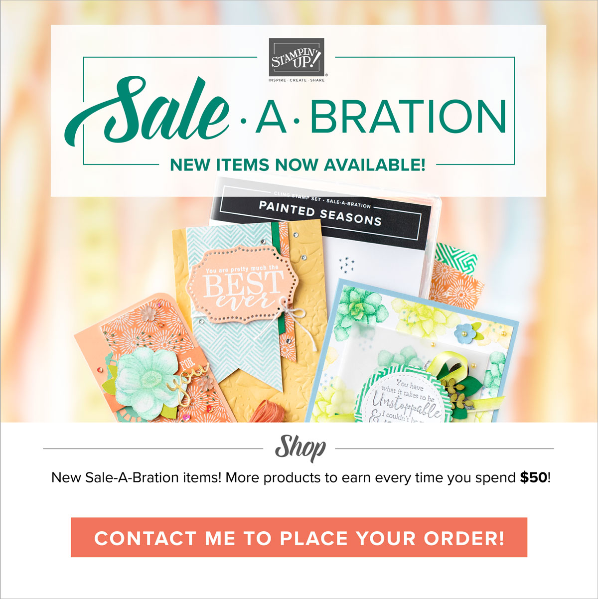 So what is Sale-a-bration?? It is a great way to get FREE stuff ~ for every $50 you spend on Stampin’ UP! goodies (exc shipping and tax) – either from the Annual Catalog or the 2019 Occasions Catalog or even the Clearance Rack; you can choose an item from the Sale-a-bration catalog and there are 13 different items to choose from, stamp sets, ribbons, papers, dies, kits, you can collect as many in one order as you want from that amazing little catalogue. Click here for more info