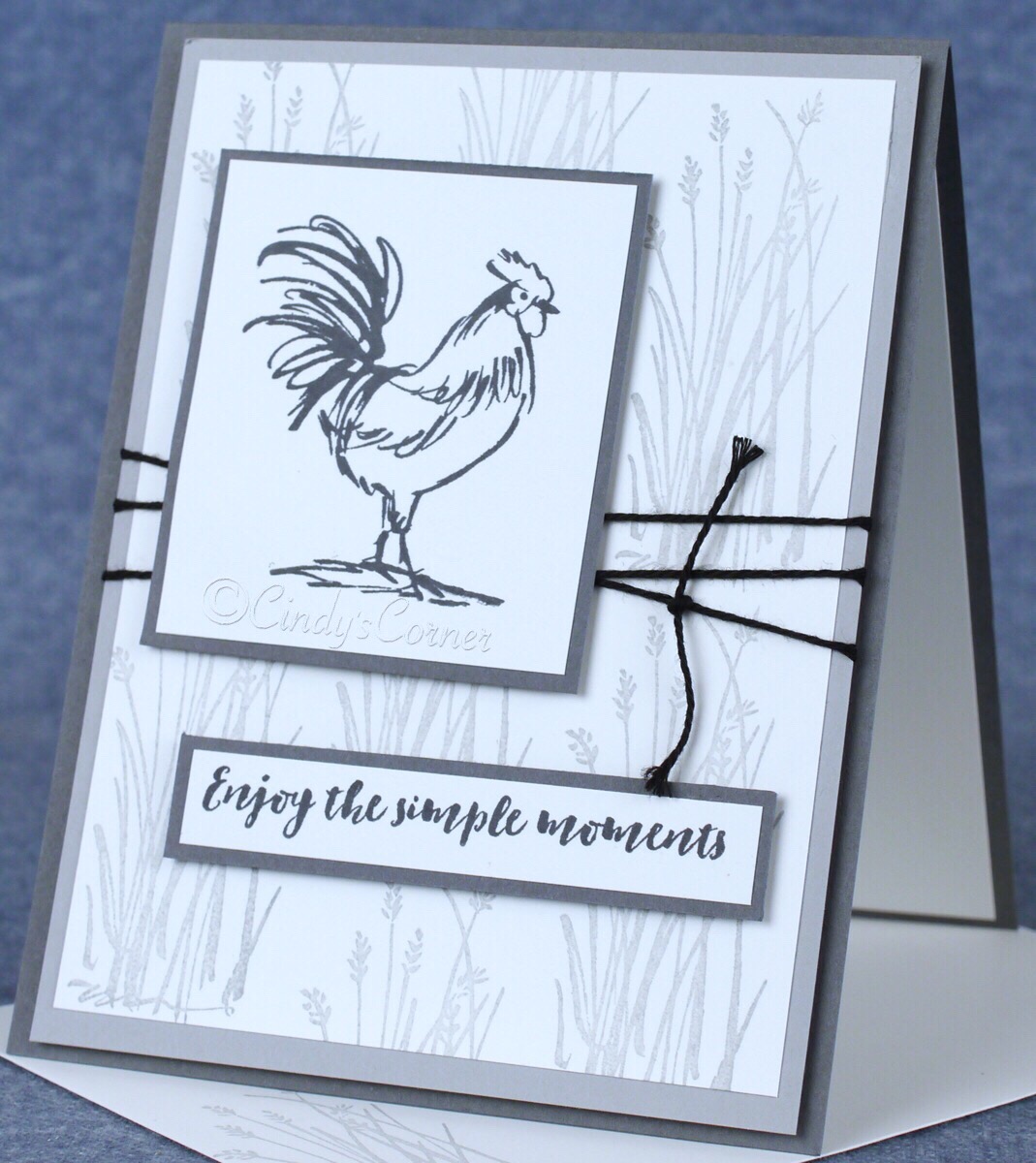 I stamped layer 2 with the grassy image before attaching it to layer 1 with Multipurpose Liquid Adhesive, then wound some Black Bakers Twine around before attaching it to the base card with 4 – 5 Mini Stampin Dimensionals. The rooster and greeting are stamped in Tuxedo Black Memento Ink and both attached to the card with some Mini Stampin Dimensionals.