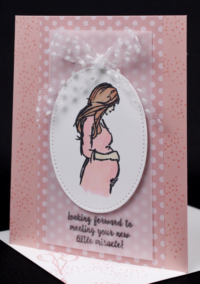 The woman is colored using Stampin Blends ~ Ivory for the face and arms then the Light Flirty Flamingo for the dress, to tone it down a little I used the Light Crumb Cake Blend Pen. The Mum-to-Be is auburn so I used the light Cajan Craze Blend then again toned it down with the Light Crumb Cake pen.