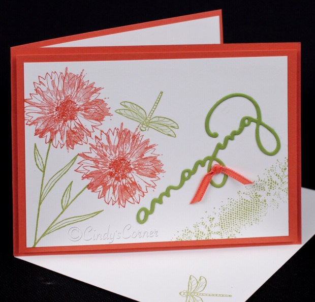 I stamped the stem/leaves first then added the flowers, dragonfly and the ‘dotty’ texture in the bottom right hand corner. The ‘amazing’ is cut from Pear Pizzazz card using the Celebrate You Thinlets which I attached with Multipurpose Adhesive Sheets (soon to retire so get some in your stash right now!)