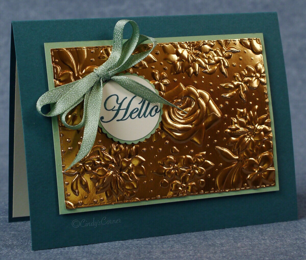 Pretty Peacock is the third of the 5 new Stampin’ UP! in-colors for this year, I have done a little experiencing with some of the other colors in the SU family and have paired it with some Mint Macaron and the scrummy Copper Foil, which in all honesty was the starting point for my card today. I had a piece left from another project, the surface was a little scuffed so I ran it thru the BIG SHOT with the Country Floral Embossing Folder and I fell in love!