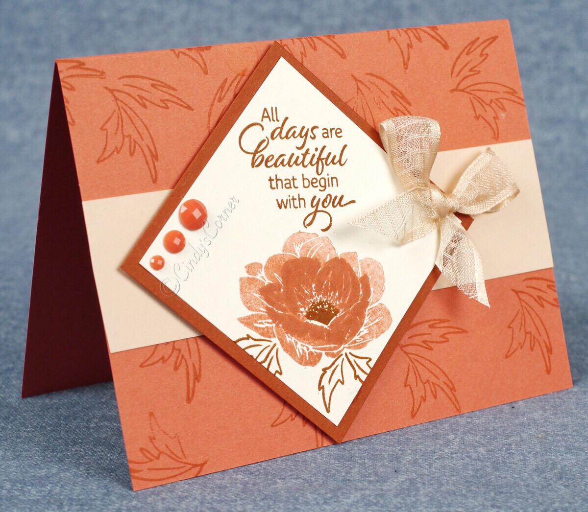 The greeting is in Cajun Craze ink which I stamped first then added the flower, the larger stamp was inked in Terracotta Tile, ‘stamped off’ on a piece of scrap paper then stamped onto my Very Vanilla layer without re-inking. The smaller flower was stamped using full strength ink ~ this is a technique known as ‘2 step stampin’ and gives you the lovely variation in color from the same ink pad!!