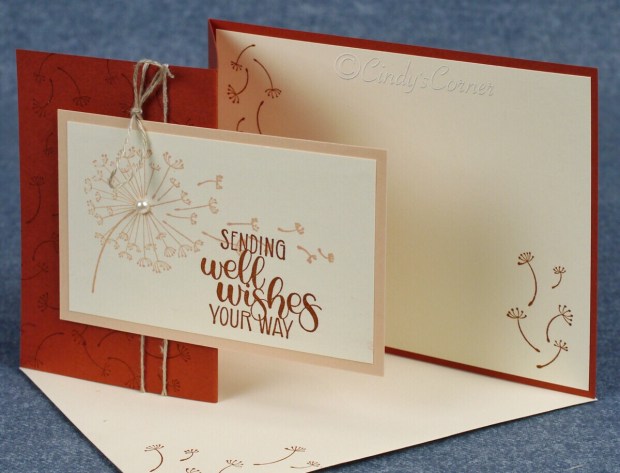 There are some particular favorite stamp sets that carried over from last year and one of them is Dandelion Wishes. A few months ago I ‘tripped over’ the color combination of Cajun Craze and Petal Pink – it fascinated me then and still does today, so my card features this combination along with another favorite – a simple Z-fold card.