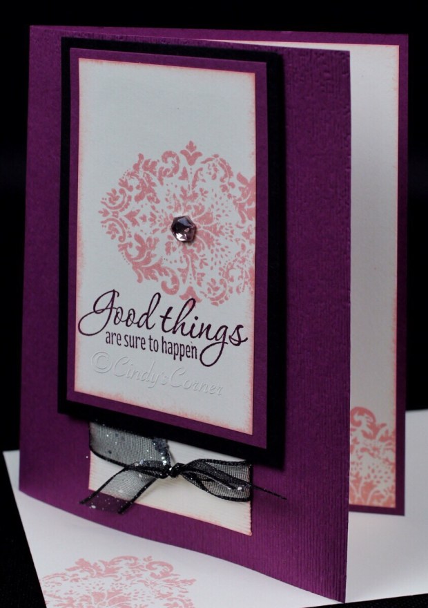 I used the new Tasteful Textures Stamp Set for this card – it has 3 nice ‘texture’ stamps and 7 greetings so has a lot going for it! Some 3/8 Glittered Organdy Ribbon and a Petal Pink Rhinestone were used for embellishments. During my video you will see I switch from portrait to landscape just to show the design works well either way!