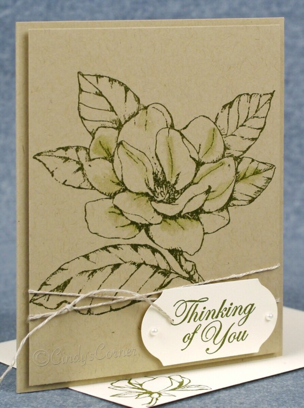 Today’s card is a very simple design – using the beautiful Good Morning Magnolia Stamp Set. I try to use just one stamp set on a card and I particularly liked that this set has 3 great greetings that will fit into the punch I wanted to use as well as smaller flowers and leaves for decorating my envelope and the inside of the card.