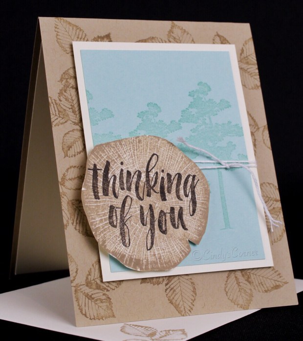 Today’s card is one my ladies made in a recent Card Buffet – I get a lot of requests for ‘Get Well’, Sympathy and the like so I figure that ‘Thinking of You’ covers all those bases! The Rooted in Nature stamp set is one I go to a lot – mainly because I just love that little cluster leaves stamp, and my colors are quite muted and not too jazzy so I think it would make a great guy card with a little change in the greeting.