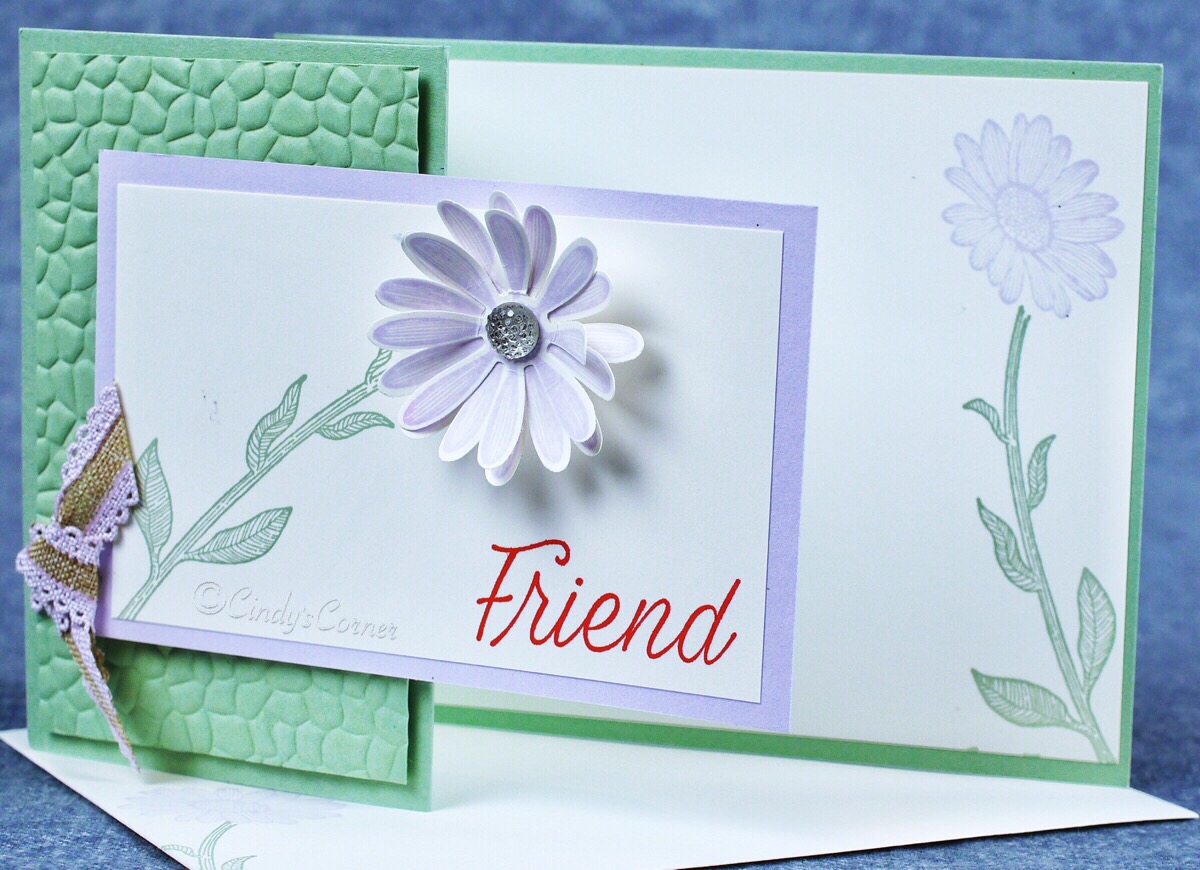 This is a simple Z-fold card, the embossed layer is attached with Stampin Dimensionals with a little of the very pretty 1/2″ Purple Posy Scalloped Linen Ribbon added with a small knot (click here to see how I do my faux knots)