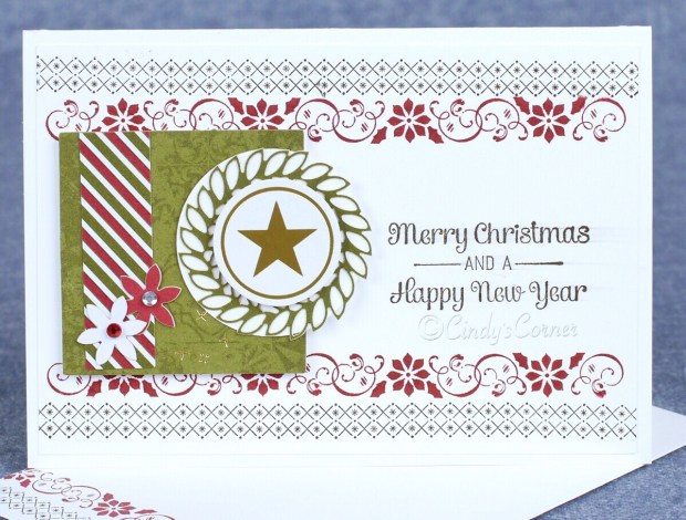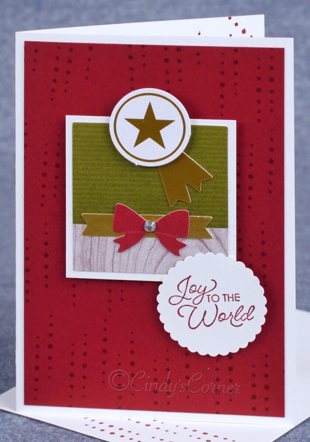 The Cherry Cobbler card layer measures 4 3/4 x 3 1/4 and stamped ‘tone-on-tone’ with Cherry Cobbler ink. The whisper white card layer measures 2 1/8 x 2 1/8. The greeting is from the Itty Bitty Christmas Stamp Set cut with 3/8 Scalloped Circle Punch. Click here to learn more about tone on tone stamping.