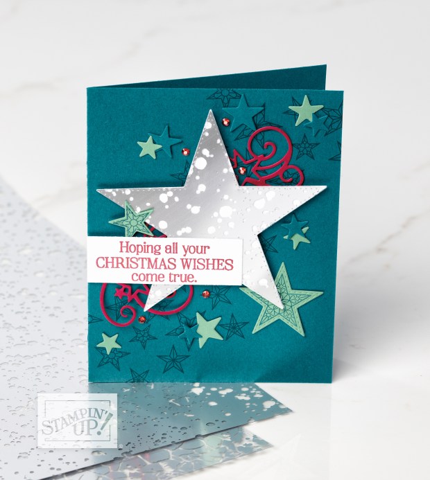 We have a Christmas card sneaking into my blog today. The Mercury Glass Acetate Sheet is in the 2019 Holiday Catalog – it is so pretty and gives our card projects such a pop when used.