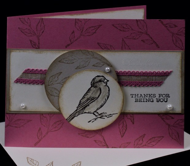 The bird is stamped onto a 2″ circle of Very Vanilla and layered onto 2 1/4 circle of Sahara Sand. Although it does not really show very well the bird is colored in with Wink of Stella, liquid glitter. A strip of the Rococo Rose Scalloped Ribbon is attached with 3 Mini Glue Dots and pulls everything together.