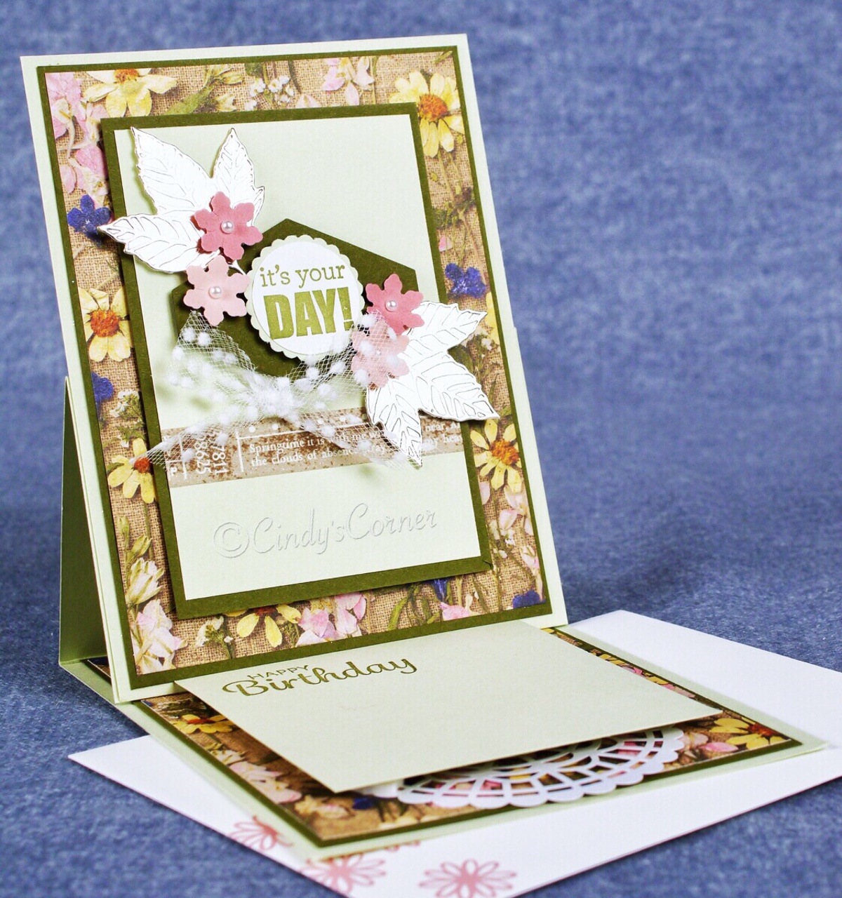 I also used one of the 2020 Sale-a-bration items, the Small Bloom Punch and Here’s a Card Stamp set, that is in the 2020 Mini Catalog as well. The Pressed Petal Specialty Designer Paper is so very pretty and I have added to the prettines with flowers, leaves, pearls and the very delicate Whisper White Polka Dot Tulle Ribbon. If you love the fold but don’t want to add the calendar and sticky notes I have included an idea for just making the card. So enjoy………………………………