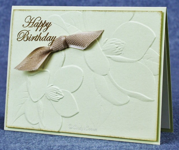 I have used the Magnolia 3D embossing folder to be the focal point of my card, some simple ink distressing and a little knot of ribbon, perfectly chic and elegant.