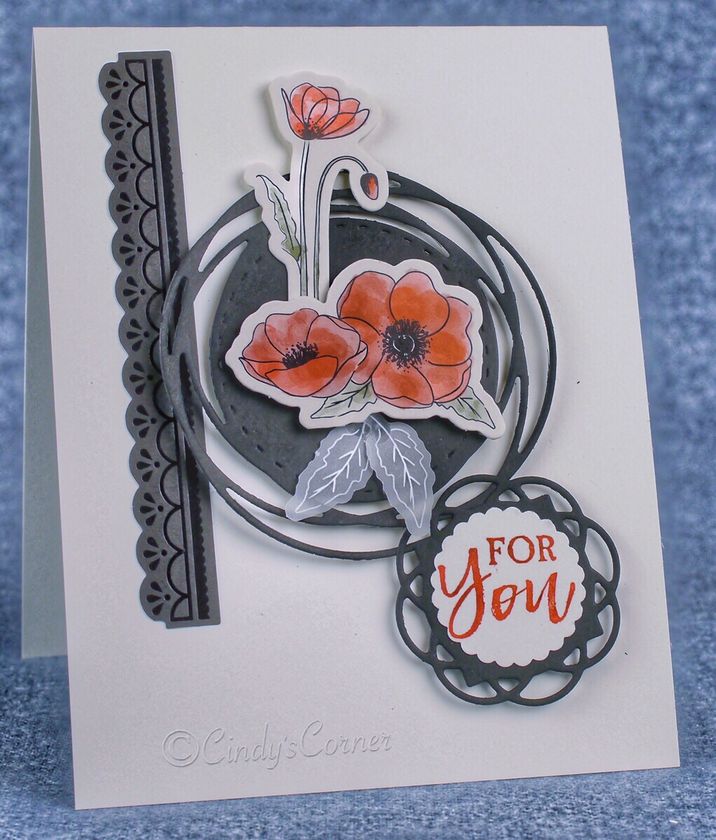 Tucked away in the corner of page 25 of the 2020 Mini Catalog are the Peaceful Poppies Elements, a pack full of little gems ~ die cut printed accent pieces ~ some are printed in full color, others are printed on watercolor paper and vellum, perfect for coloring and them some black ‘tone-on-tone’ embossed pieces – probably over a 100 different elements to build beautiful cards.