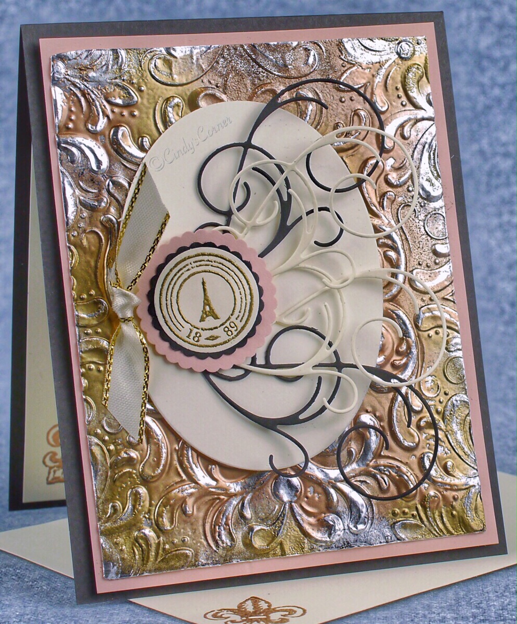 I am featuring a double embossed technique – starting with an embossing folder – sometimes known as ‘dry embossing’ then followed up with heat embossing where embossing powder is melted onto your card using a heat gun! I am waving a fond farewell to a several products that are retiring at the end of May (available while stocks last) Copper Embossing Powder , Parisian Beauty Bundle, 1 5/8 Scalloped Circle, 1 1/8 Scalloped Circle and 1″ Circle Punches.