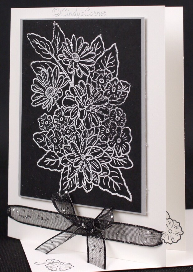 Today is full of sparkle – Shimmer White Embossing Powder and Glittered Organdy Ribbon, I pulled out my Heat Tool and the Ornate Style Stamp Set to create this card with lots of impact. The sparkle in the embossing powder does not really show too well but really is very sparkly in person!