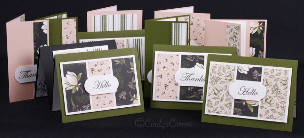 Using the Magnolia Lane DSP with Mossy Meadow and Petal Pink card, I have designed it so that you can use any greeting stamp set and ink pad that you have in your stash, you will also need some adhesive and Stampin Dimensionals to complete your cards.