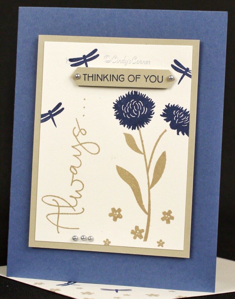 The ‘Always….’ was stamped first, followed by the stem and leaves, by doing it this way I can make sure I have enough room on my card. Then I added the Night of Navy flowers then backfilled with the mini flowers and the dragonflies.
