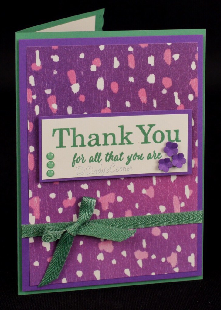 With such a choice of bright and vibrant colors, it was a tough choice but I had a light bulb moment ~ we have some Designer Series Paper that has lots of these bold colors ~ Artistry Blooms DSP has a sheet with both Gorgeous Grape and Melon Mambo. I then chose Just Jade as my base card color with the coordinating ribbon and enamel dots to pull everything together.