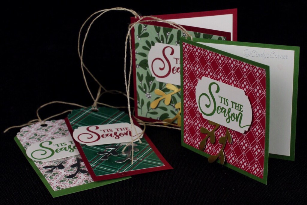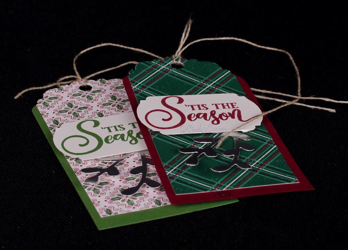I used Garden Green and Cherry Cobbler Card and ink on both styles of tag, which are a couple of the colors within the ‘Tis the Season decorative papers. You can buy a pack of card with both of these colors rather than a full pack ……. scroll down for the link to my on-line store 🙂
