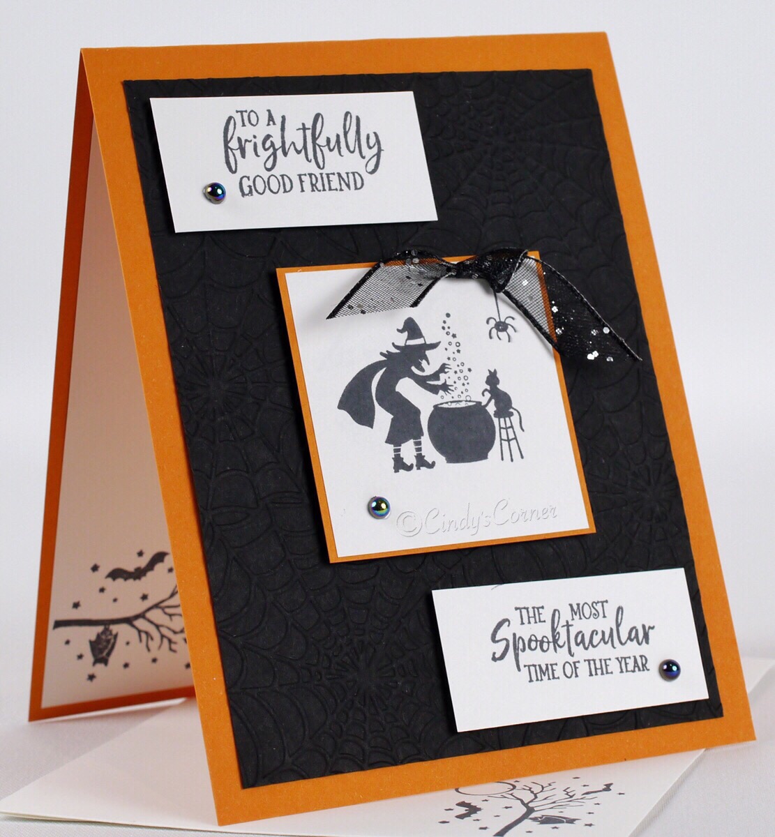 Just 10 more days before Halloween, time for another Halloween card, this time featuring the lovely and fun images from the Ghoulish Goodies Stamp Set. If you look very closely you will see I used the Cobwebs 3D Embossing Folder on the Basic Black layer ~ how cute is that ?