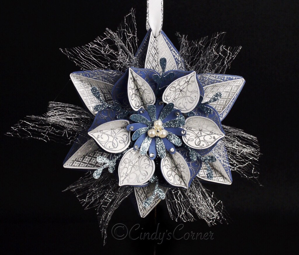 Very pretty – a girl after my own heart with blue and silver – love the use of the daisy punch for the center of the ornament!