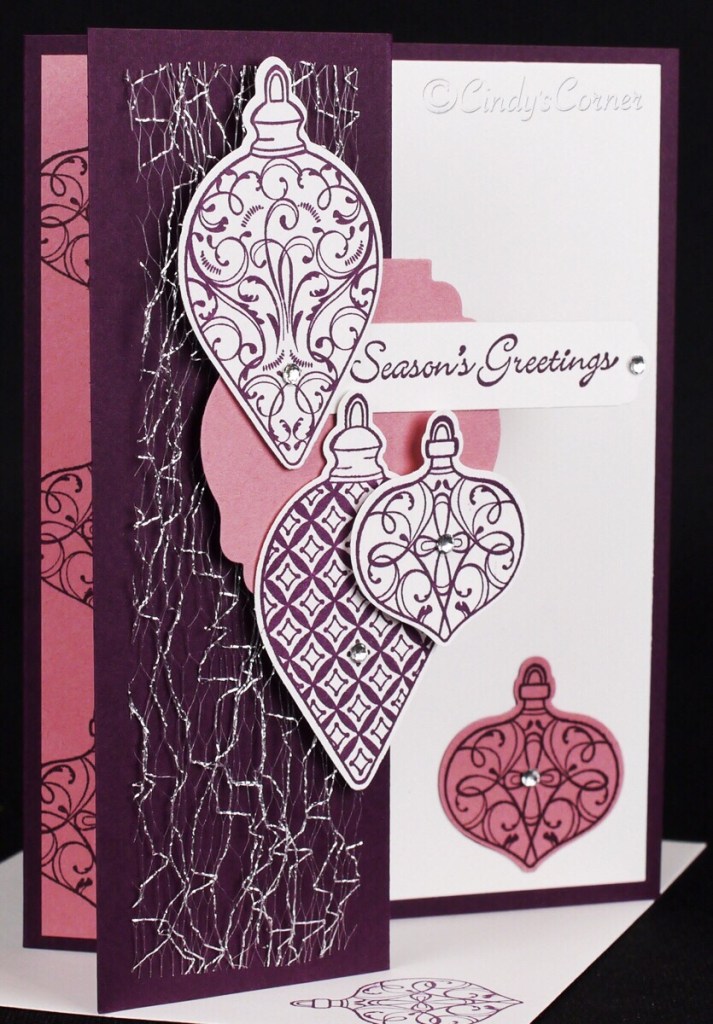 But sometimes I like a little ‘non-tradition’ to creep in, so I have a tree in my hall that is decorated in purples and pinks and chose to use similar colors for today’s card, Blackberry Bliss and Rococo Rose, to create this ‘lazy Z fold card’