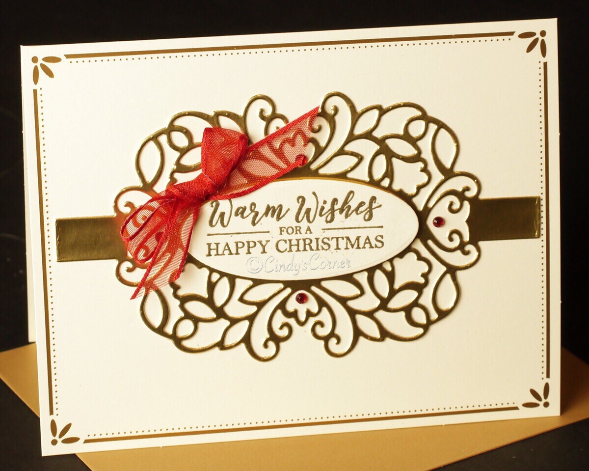I used a pack of ready made card bases for this card, they are Very Vanilla and has the metallic edging already printed on them – how easy is that as a starting point for making a card? The greeting is from the Best Year Stamp Set and is heat embossed with Gold Embossing Powder, cut with the oval die in the Detailed Bands Dies. My bow is tied using 3/8 Real Red Sheer Ribbon and attached with a Mini Glue Dot then a gentle scattering of Red Rhinestones.