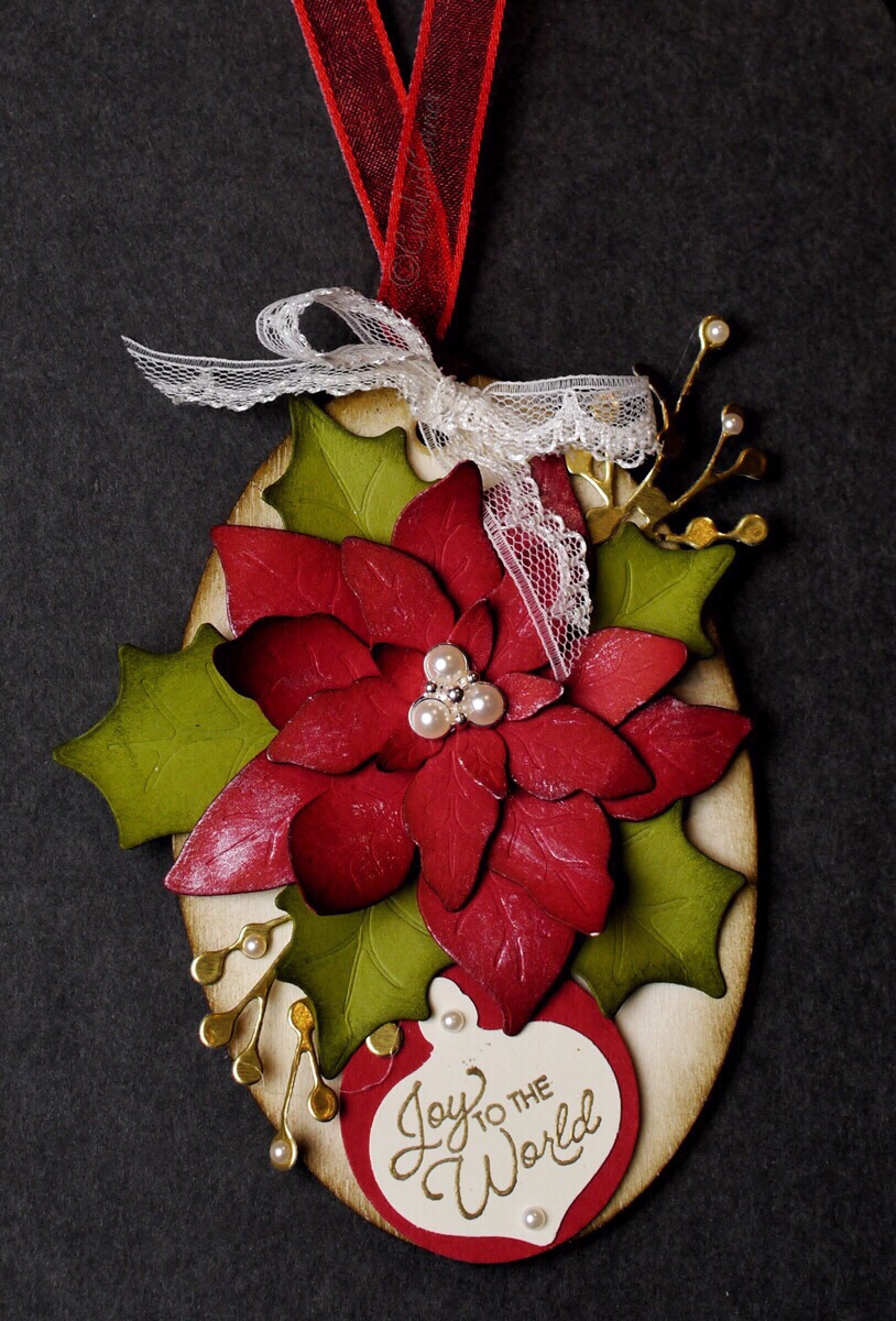 The poinsettias are made with the Poinsettia Dies with Real Red Card and Old Olive Card. I sponged all the edges then added at little Frost White Shimmer Paint to a Stampin Spritzer topped up with some Isopropanol Alcohol, to put a soft sheen on the ‘petals’ Each layer is attached together with a Stampin Dimensional then a stunning Beaded Pearls Embellishment. The berry sprays are cut from Gold Foil.
