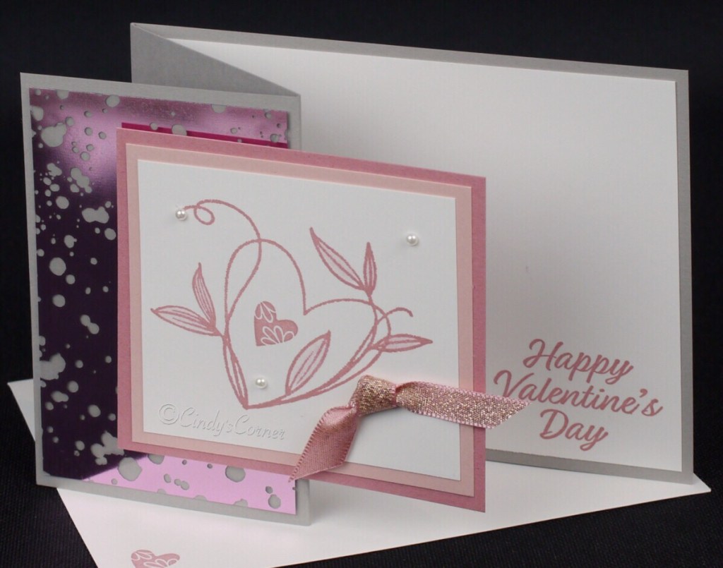 Today’s card uses the Touched My Heart Stamp Set which is one of the sets you can get for free for hosting a party or if you place an order for $150 of Stampin UP goodies! I have been surprised on how versatile it has been, it has a beautiful heart stamp with leaves twisting and curling around it just perfect for Valentine or maybe a wedding or anniversary card. I have paired it with the Meant to Be Stamp set for my greeting.