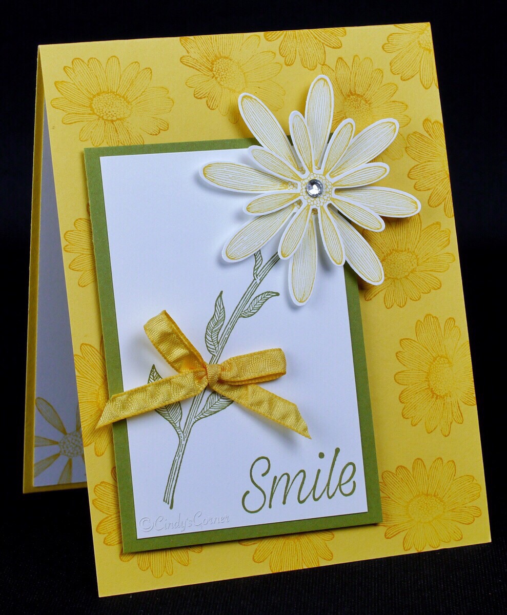 I stamped the greeting first then added the stem – taking up as much space as I could. The daisies are stamped on a scrap of Basic White Card then punched with the Daisy and Medium Daisy Punches. These are layered together with a Stampin Dimensional then added to the card with another; then a little bling with a Rhinestone Basic Jewel in the middle. The little bow of 1/4 Ruched Daffodil Delight Ribbon is attached with a Mini Glue Dot.