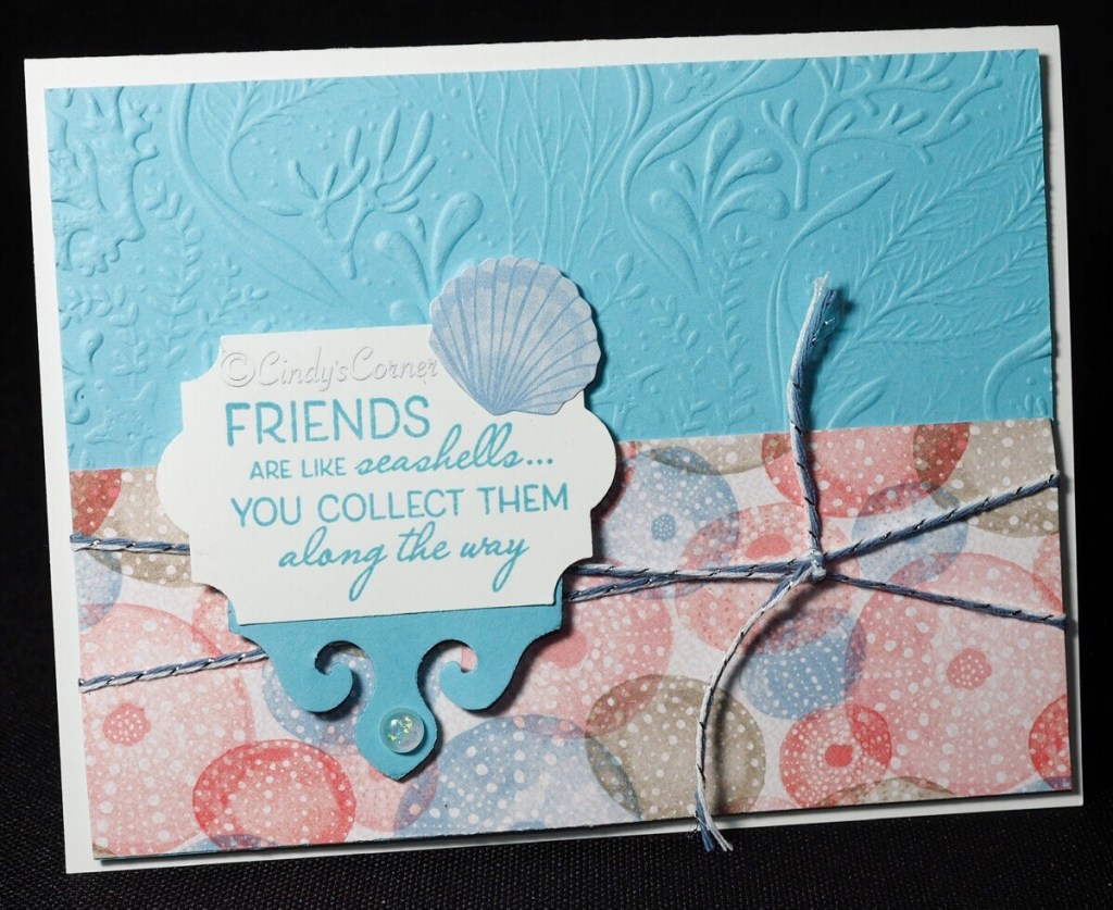 The greeting is from the Friends are like Seashells Stamp Set, cut using the Everyday Label Punch then layered onto card cut with the new Elegant Tag Punch.
